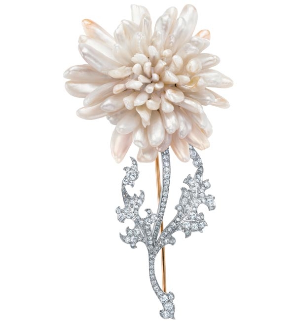 Dr. George Frederick Kunz was the world's premier geologist when Charles Lewis Tiffany (yes, that Tiffany) sent him on a pearl hunt. In the Mississippi River Valley, he found a plethora of small, elongated "dogtooth" pearls. These were made into the Chrysanthemum brooch. The beautiful bud is set off by diamond studded leaves, and stems of gold and platinum. A comic opera star of the day, Lillian Russell, was given the brooch in 1904. It now resides in the Smithsonian Museum.