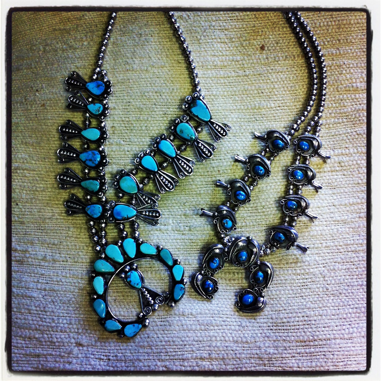Squash blossom necklaces are one of the most characteristic traditional jewelry designs from the Navajo and Native Americans of the Southwest. The necklace is commonly made with strands of silver beads, enriched with silver beads that have petal-like additions, called "squash blossoms". The centerpiece of the necklace is a crescent- (downward facing horseshoe) called a "naja"- often encrusted with turquoise, silver beads, or other stones set in silver. Many believe that the naja were adapted from the iron horseshoes that ornamented the horse bridles of Spanish conquistadores.